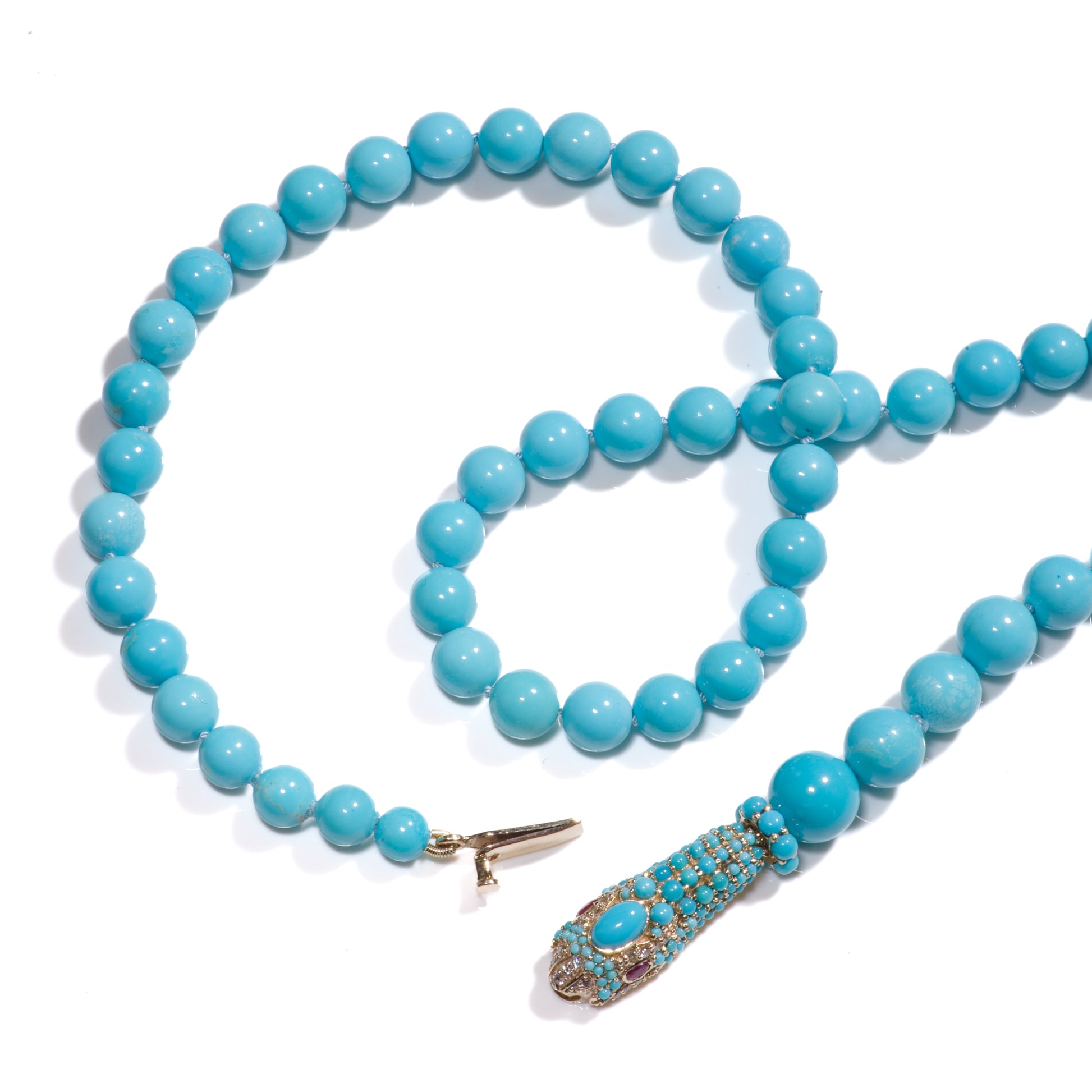 A regal giant 17 inch long handcrafted necklace with extremely rare and pure untreated Sleeping Beauty Turquoises, natural diamonds and genuine rubies. This necklace features fine Robinson Egg Blue turquoises from the sleeping beauty mine in Arizona, delicately hand knotted with a handmade large solid gold diamond snake clasp, creating an elegant look. The color is a very rare blue color. In sunshine it looks even more bright. The hand made clasp is set with two deep pinkish red rubies, rose cut diamonds and genuine sleeping beauty turquoises all set in 14k solid gold.