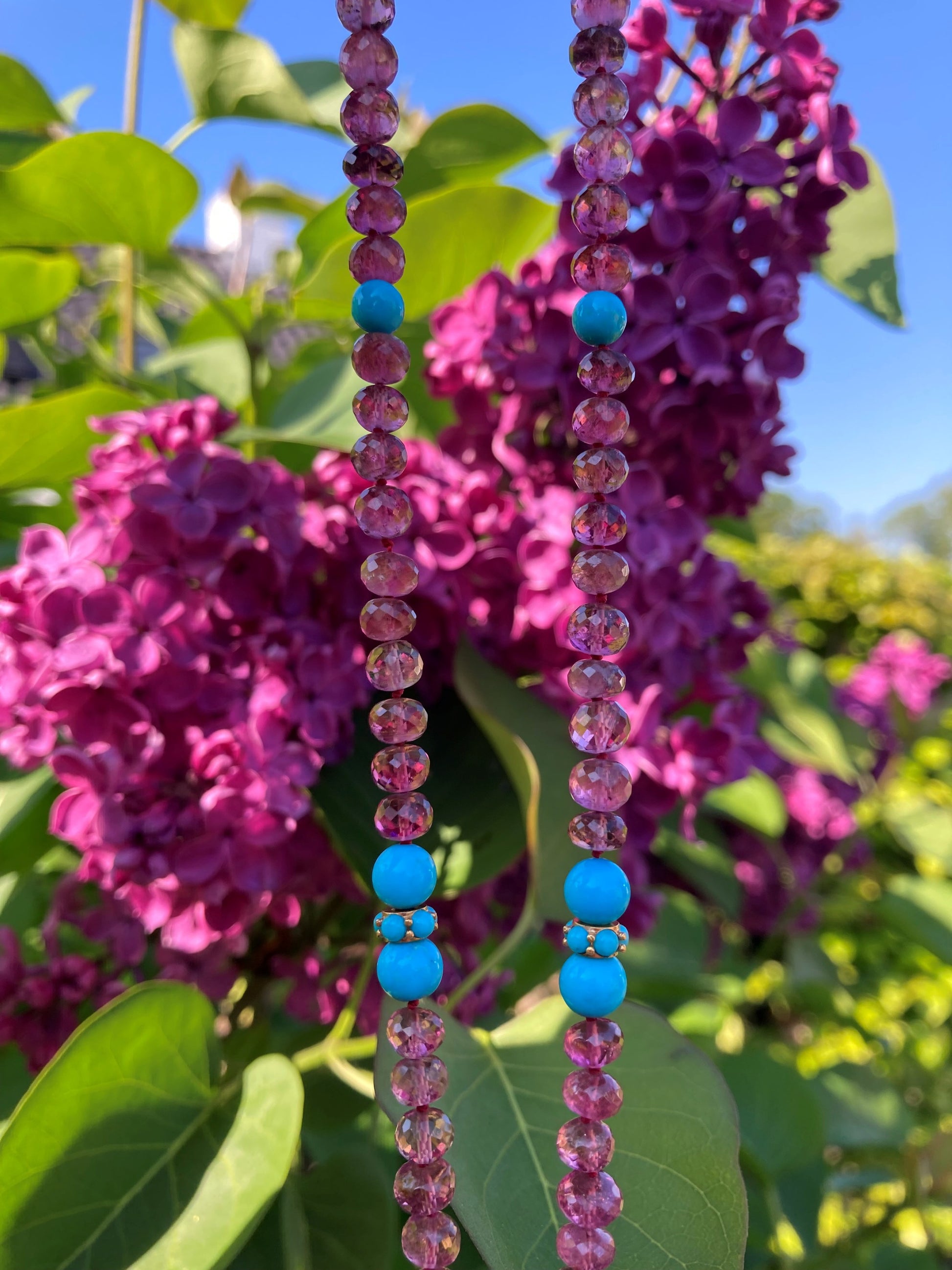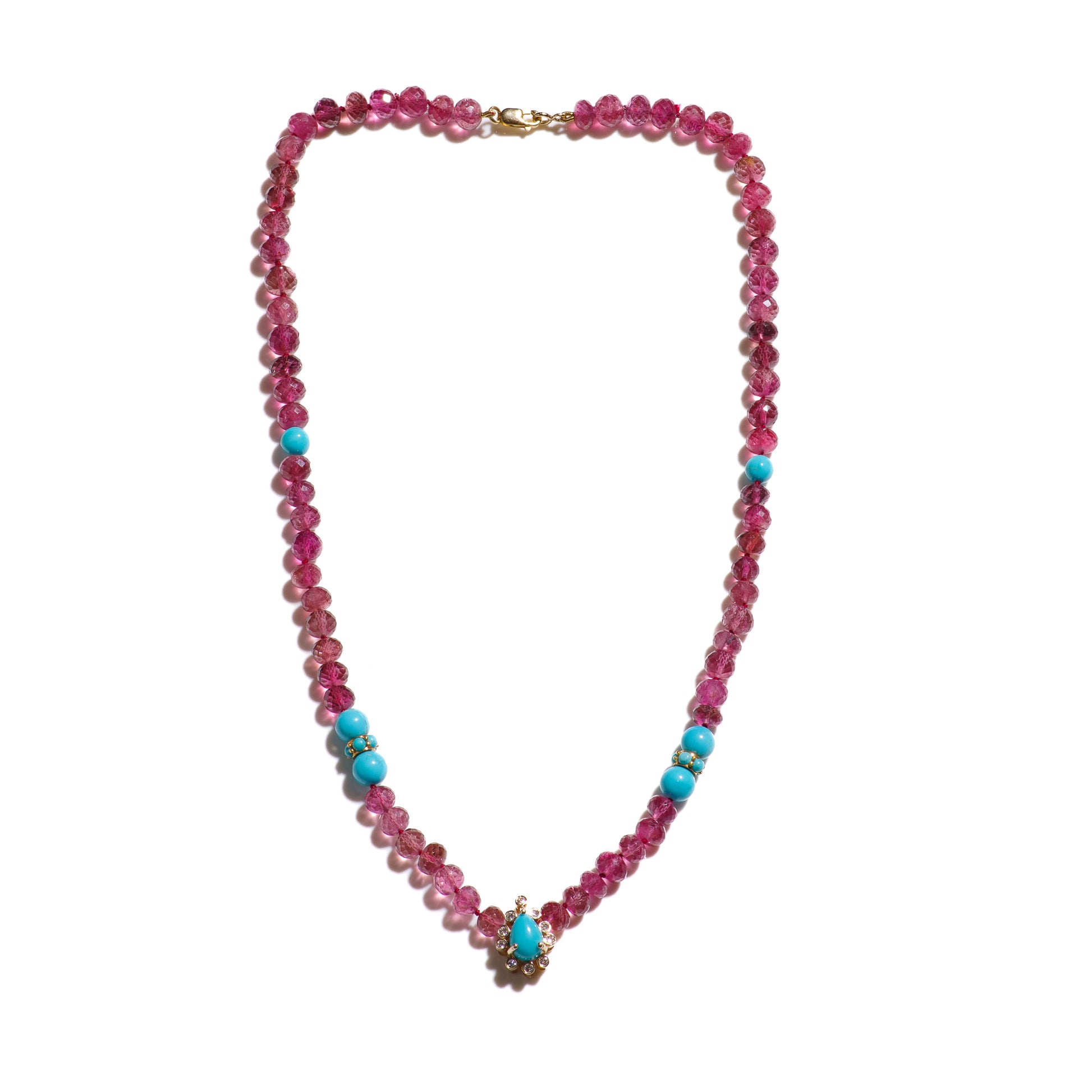 A regal 17 inch long handcrafted necklace with extremely rare and pure Sleeping Beauty Turquoises and genuine pink rubellite tourmalines from Brazil. This necklace features genuine high grade Robinson Egg Blue turquoises from the sleeping beauty mine in Arizona, delicately strung together with a handmade diamond turquoise pendant, creating an elegant look. You can wear this beauty with any outfit!