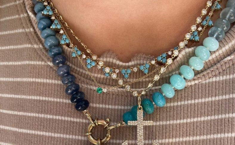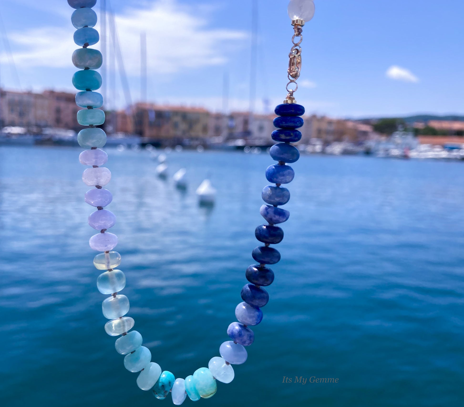 Flowy azure hues, like when the ocean kisses the shore. Capture the full spectrum of blue with this semi-precious multi gemstone necklace!